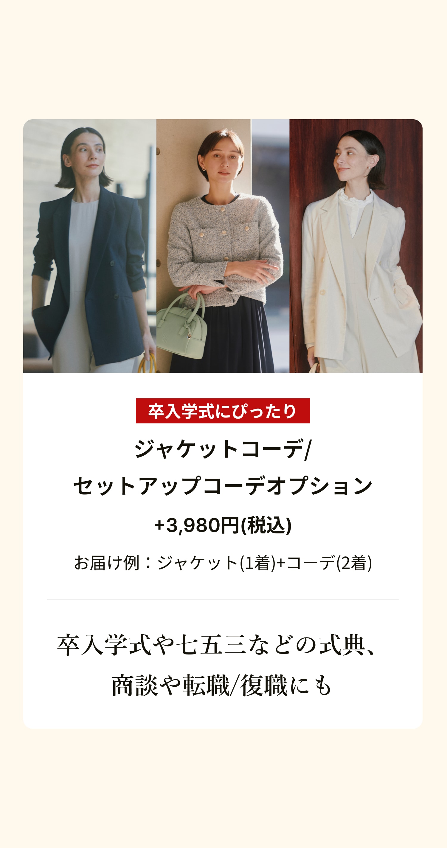 月額料金にオプション料金¥1,980(税込)/回を 追加すると卒入学式に相応しいお洋服を 使ったコーデをお届けします。