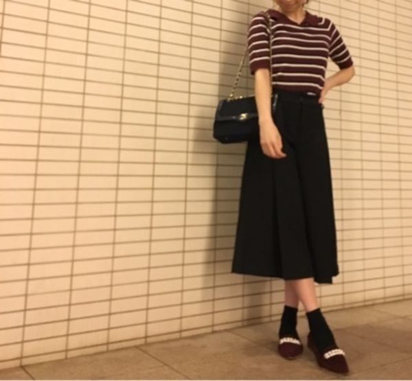 ボーダートップス×黒フレアスカートのモノトーンなコーデに、シューズでアクセントを。鮮やかなビビットピンクのポインテッドシューズを投入することで、シンプルながらも女度がアップして大人可愛いスタイルになります。