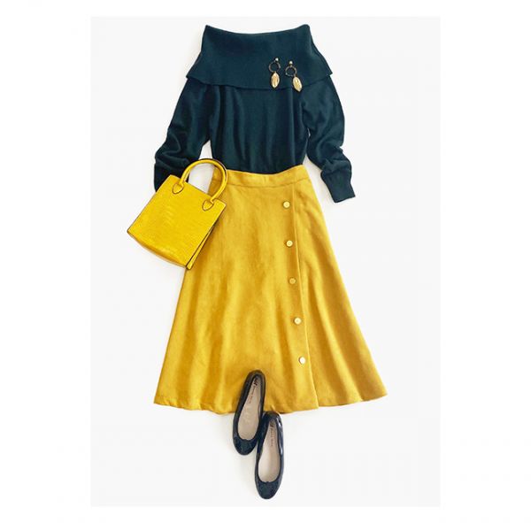 スカートの色味と合わせたバッグや大振りのゴールドアクセにすると華やかさもありつつ、まとまりますよ。