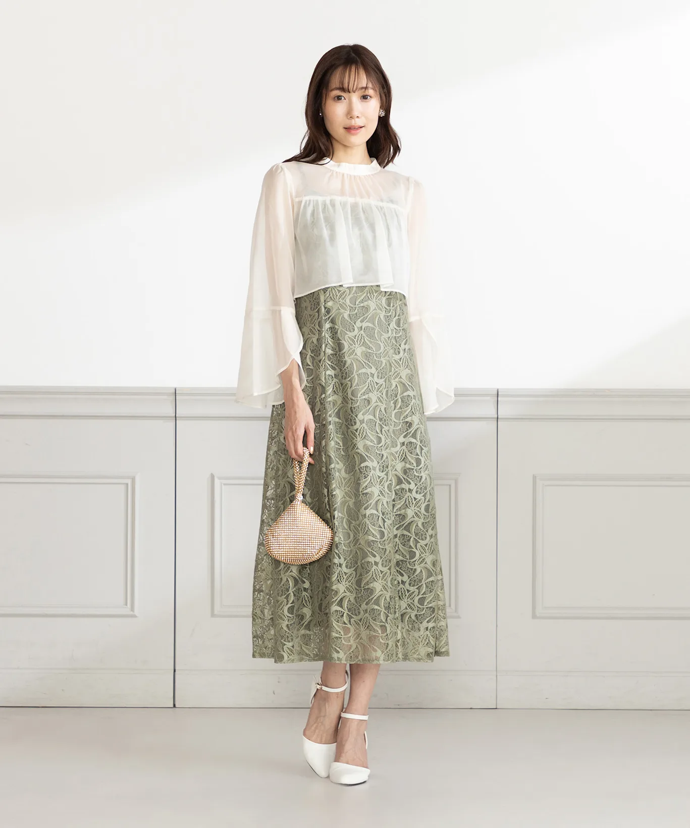小物はパールや布製バッグで統一感を出すのがポイントになります。