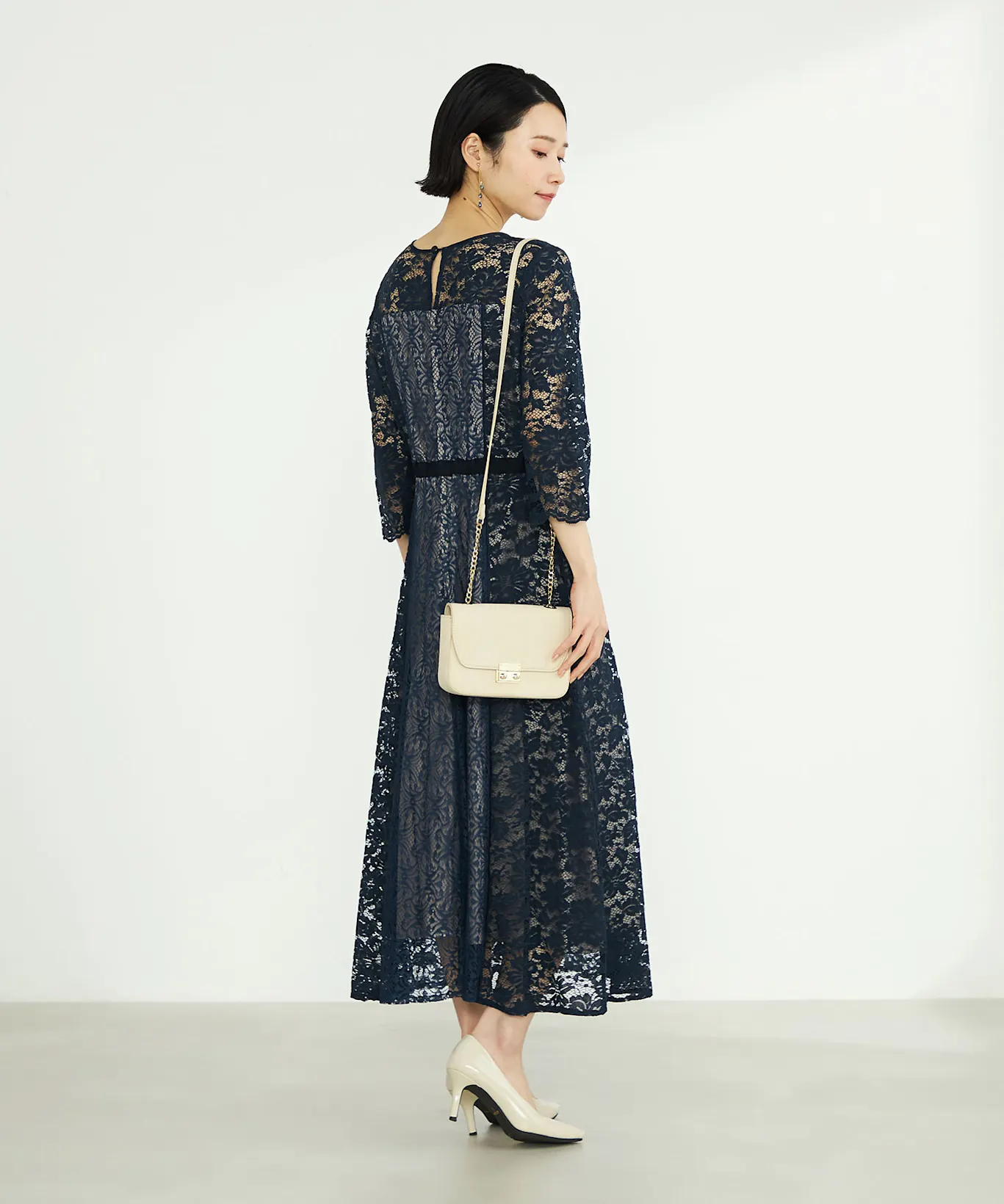 特に親族として参列する場合、ネイビーのドレスに明るいベージュを重ねれば、上品な華やかさが演出できます。